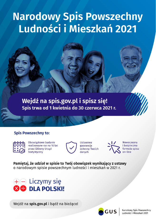 Narodowy Spis Powszechny Ludności i Mieszkań 2021 potrwa od 1. kwietnia do 30. czerwca 2021 r., jest to obowiązkowe badanie przeprowadzane raz na 10 lat przez Główny Urząd Statystyczny.